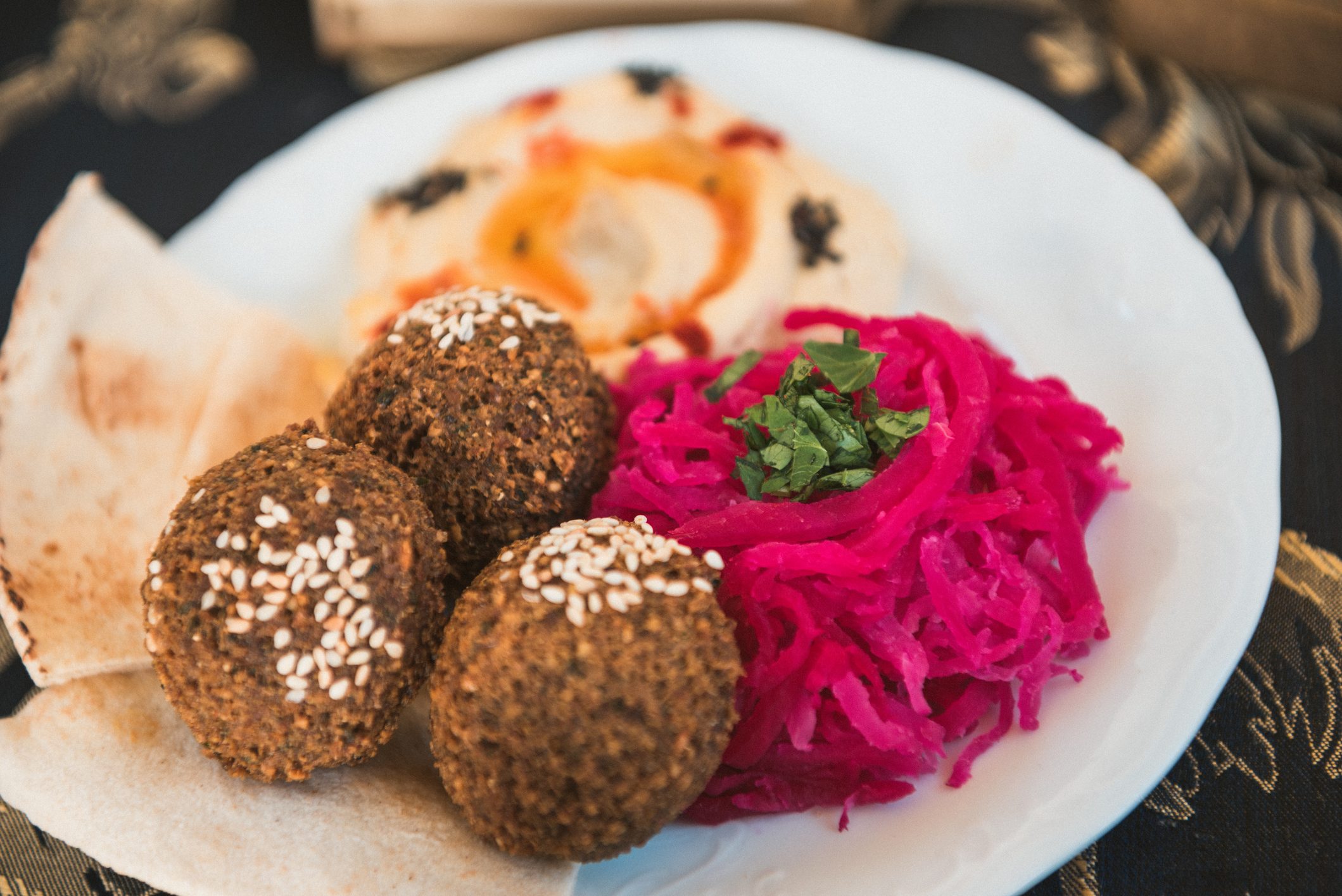 أقراص الفلافل توضع عادة مع السلطات والخضراوات المخللة، والصلصة الحارة، وطبق من الطحينة.