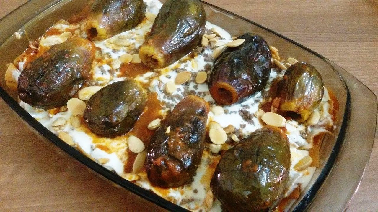 - يدعك الباذنجان قليلاً لكي يصبح طرياً وسهل التجويف، ثم يغسل وتنزع سيقانه الخضراء.