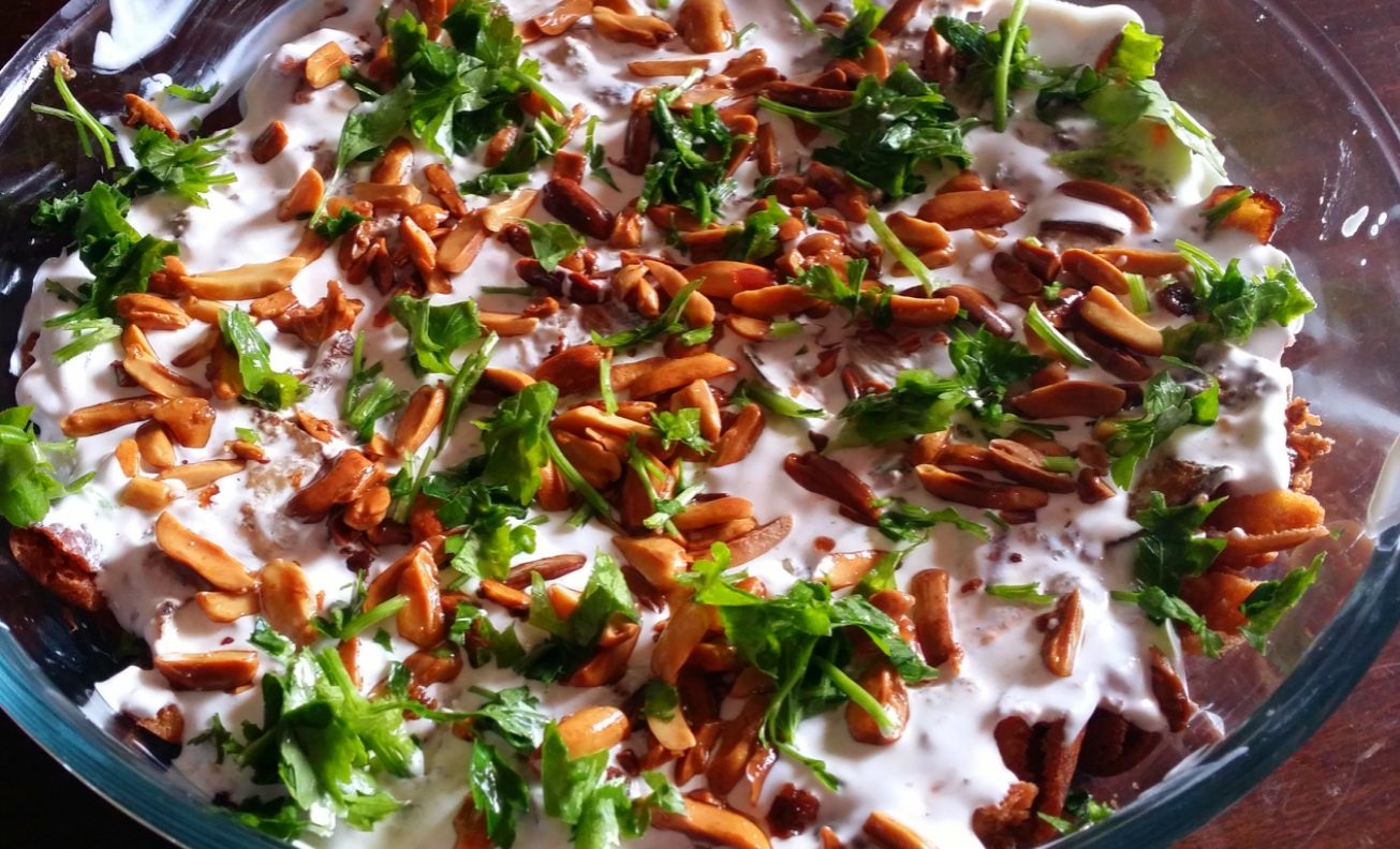 - ينثر الصنوبر المقلي المتبقي والسمن المذاب فوق اللبن الزبادي ويقدم ساخناً.