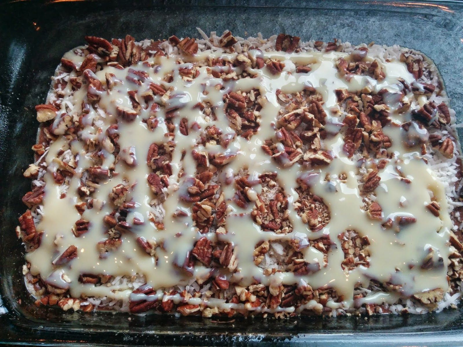 بعد ذلك قم بتوزيع الجوز فوق الشوكولا وجوز الهند.