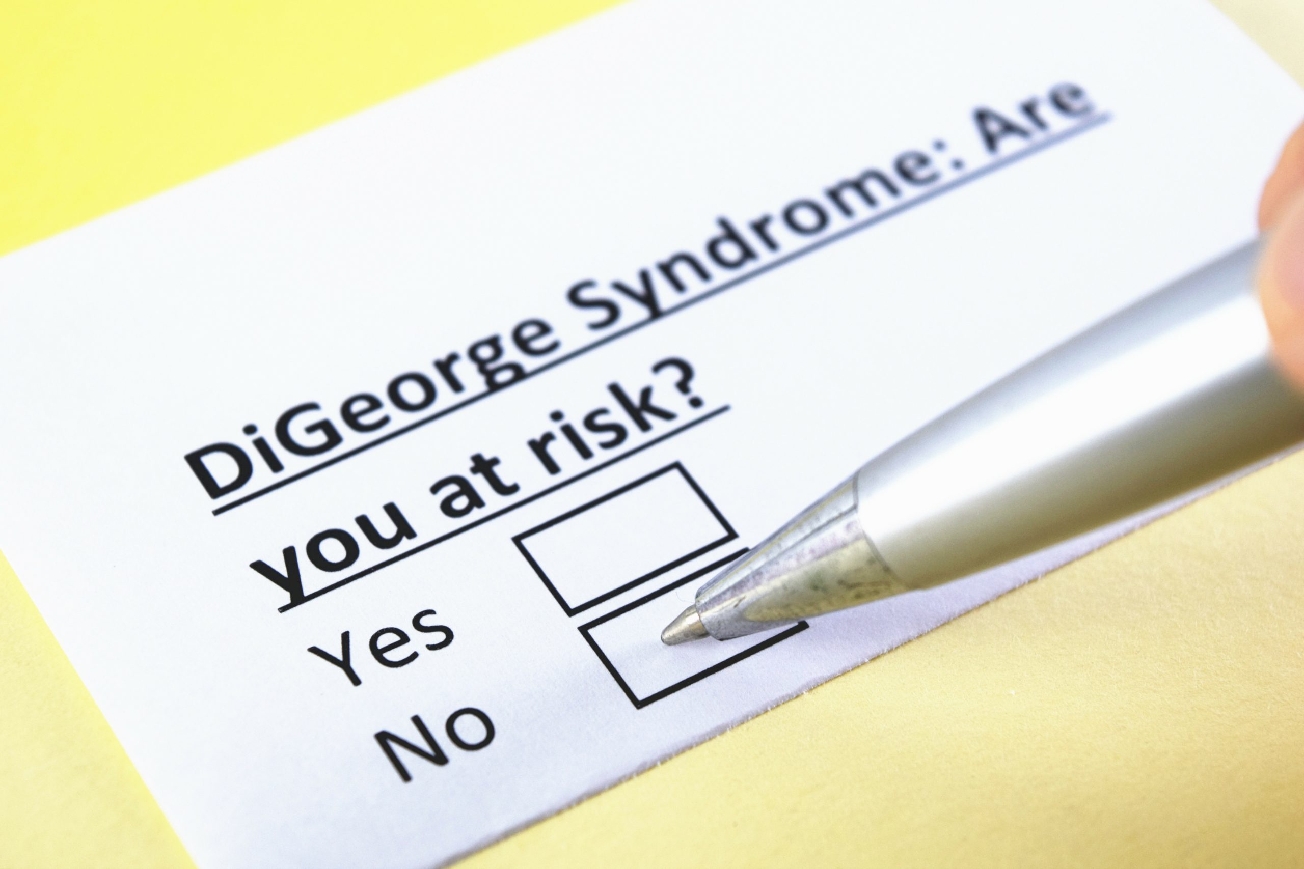 لذلك في هذه الحالات لا يوجد عادةً تاريخ عائلي لمتلازمة دي جورج وفي الغالب خطر إصابة الأطفال الآخرين به ضئيل جداً.