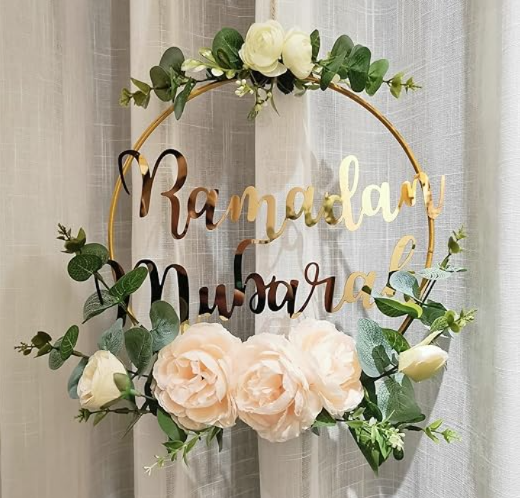 لإضافة لمسة خاصة ومعبرة، يمكن دمج الزهور مع عناصر تزيينية أخرى، مثل لافتة خشبية مكتوب عليها: “رمضان مبارك”. هذا التوليف بين الزهور واللافتات يخلق تناغماً بصرياً ويجعل الديكور يبدو أكثر ترحيباً وأناقة. وضع اللافتة الخشبية بين أكاليل الزهور يمكن أن يكون نقطة محورية في الديكور، حيث تجتمع البساطة والرقي.