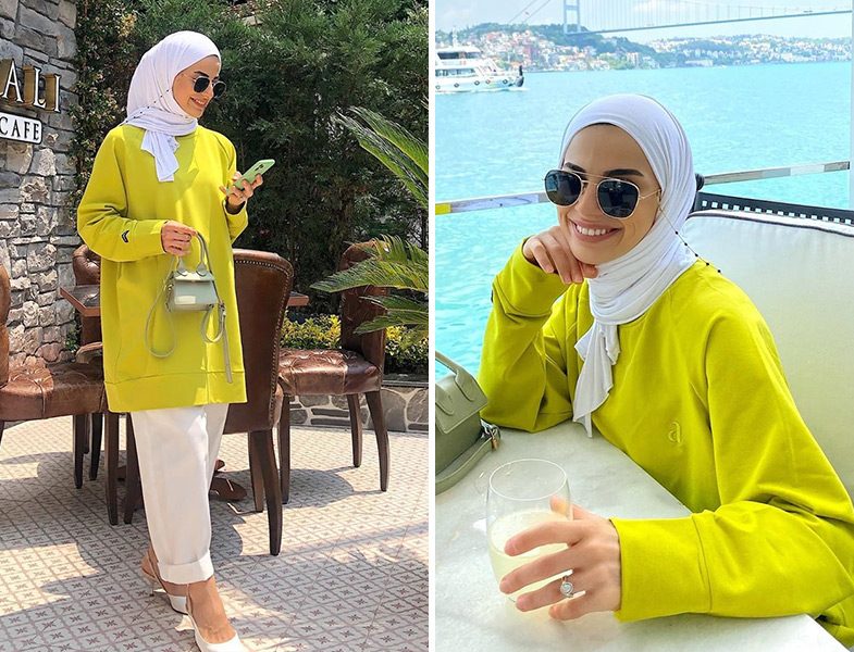ارتدي بنطالاً وحذاء أبيضين مع كنزة طويلة ليمونية وفوقهما شالاً من اللون الأبيض، ولكسر روتين هذين اللونين ننصحك بحمل حقيبة يد خضراء غامقة.