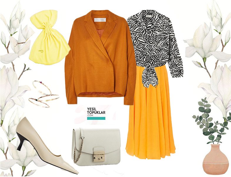جربي ارتداء تنورة صفراء غامقة أو زعفرانية مع كنزة بألوان الحمار الوحشي مع شال أصفر فاتح وحذاء وحقيبة يد من لون البيج.