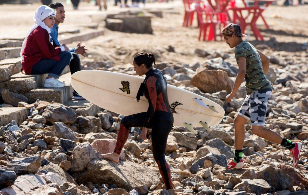 على هذا الشاطئ الشعبي في الرباط، ترتدي النساء الجلابيب أكثر من ملابس السباحة، لكن ذلك لم يمنع بعض الفتيات من تحدي الأحكام المسبقة، وذلك من خلال لوح التزلج على الماء أو ما يعرف برياضة Surfboarding.