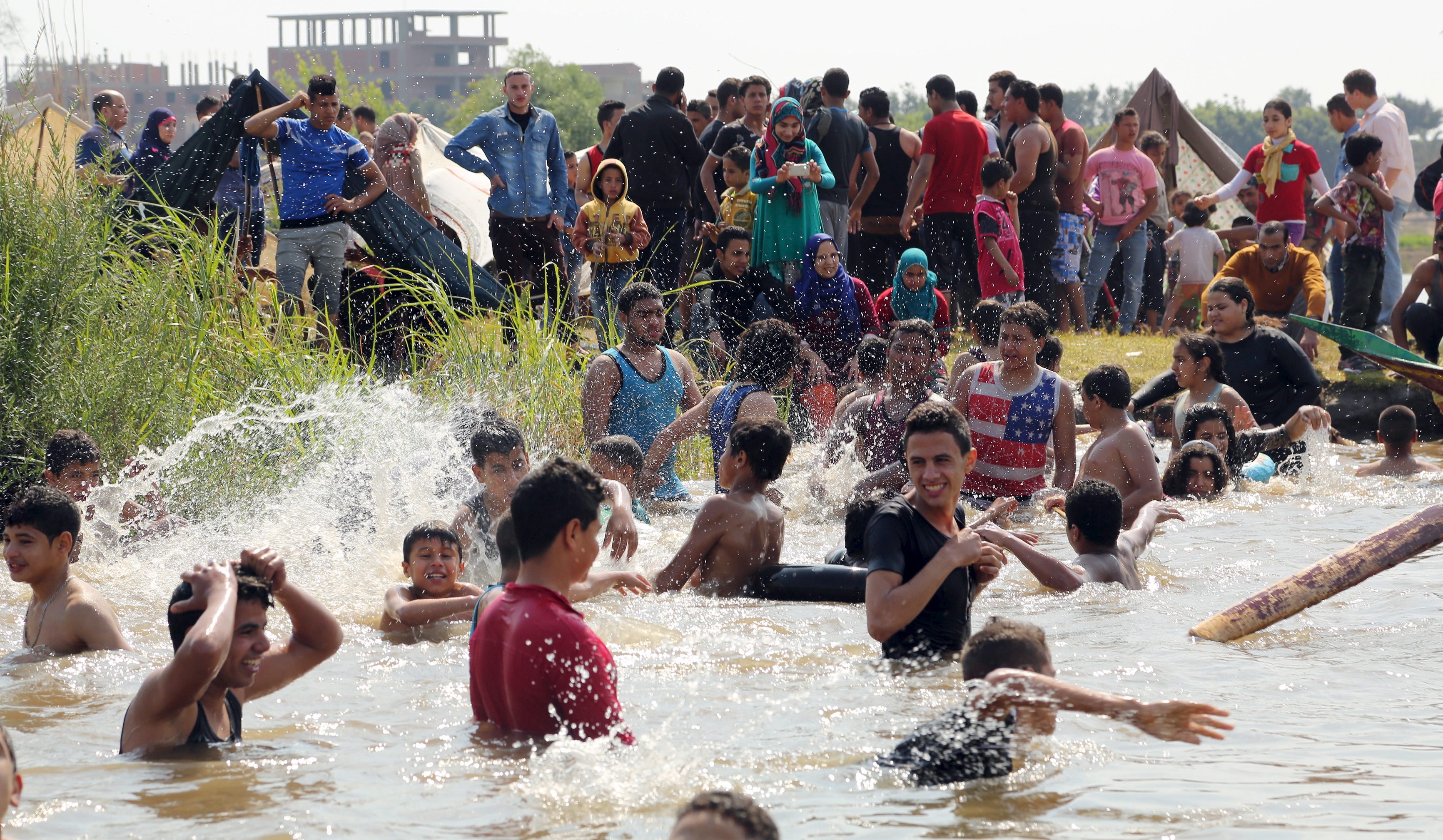 People swim in the river Nile as they celebrate the spring holiday of Sham el Nessim on the outskirts of Cairo, April 13, 2015. REUTERS/Asmaa Waguih