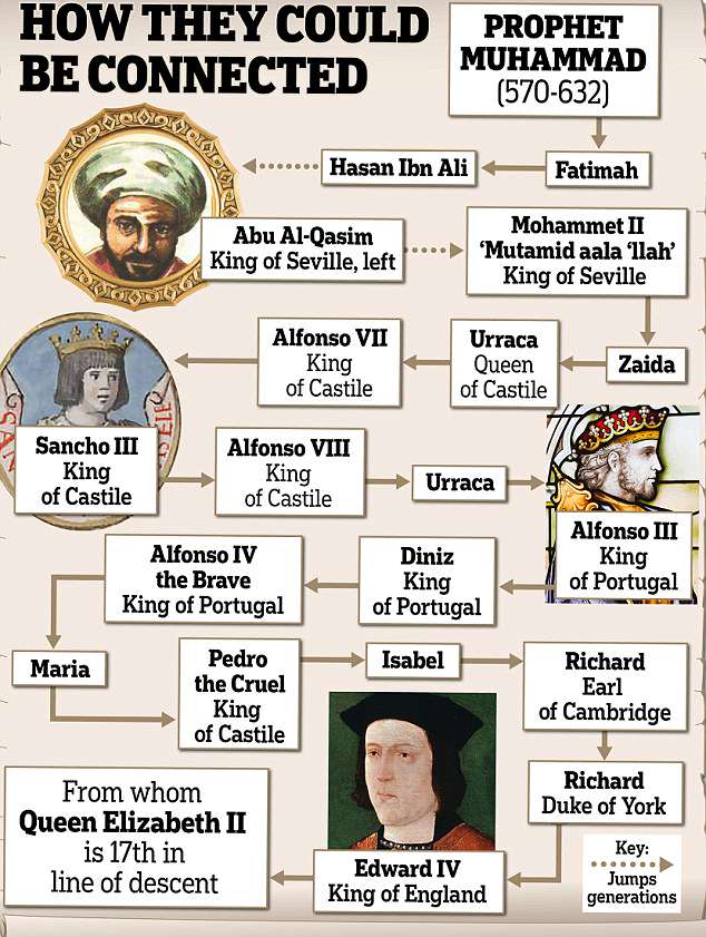 فقد نشرت صحيفة The Daily Mail البريطانية شجرة عائلة الملكة بتصميم إنفوجرافيك تضمَّن ما قالت إنه سلسلة نسب الملكة الذي ينتهي بالرسول محمد.