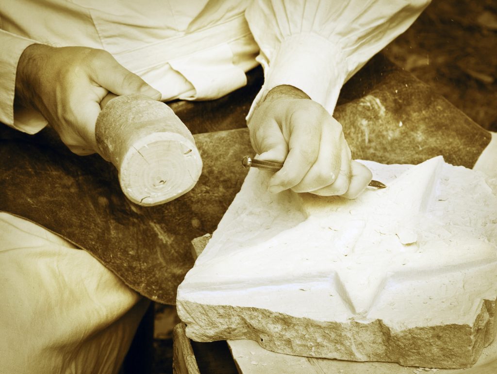 بحذر وبدقة يحاول بها مضاهاة دقة الفراعنة، ينحت محمد تحفته القادمة، مستخدماً في عملية الحفر آلة تسمى “الدبورة” (أداة بدائية صنعها أجداده عبارة عن قطعة حديدية حادة ولها يد خشبية)
