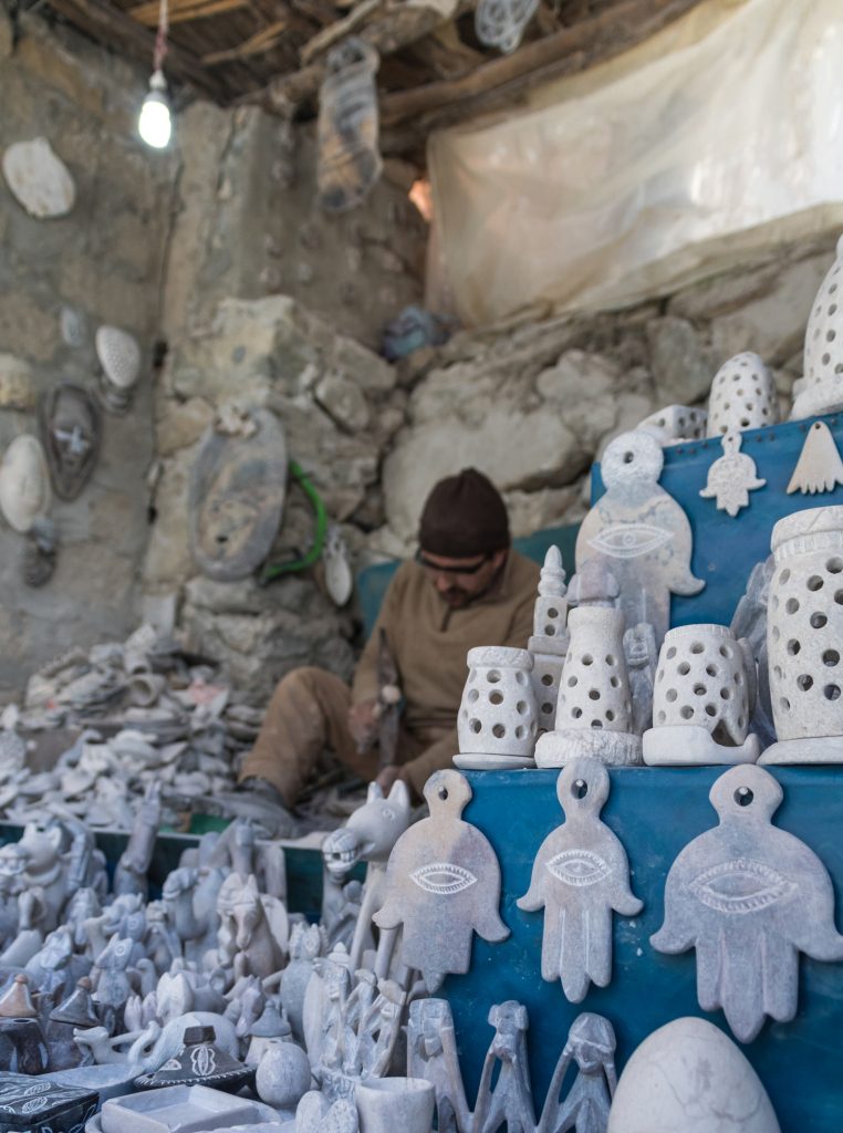 بعد ذلك، يتابع قوله، تُلف بقماش من القطن وبودرة من نفس الخامة، حتى لا تتفتت أسفل “المدجاب” (جهاز بدائي لتفريغ الألباستر)، وحتى تُصبح خفيفة الوزن.