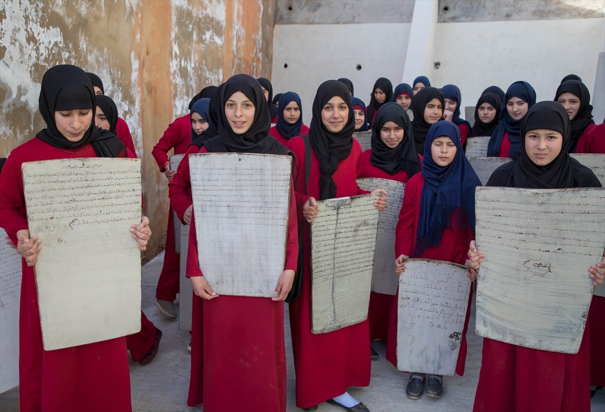 كورود مرتّبة في إكليل، تنتظم طالبات المدرسة بجلابيبهن الحمراء الموحدة حول محفّظهن، يرددن الآيات القرآنية تارة ويستظهرن ما حفظن تارة أخرى.