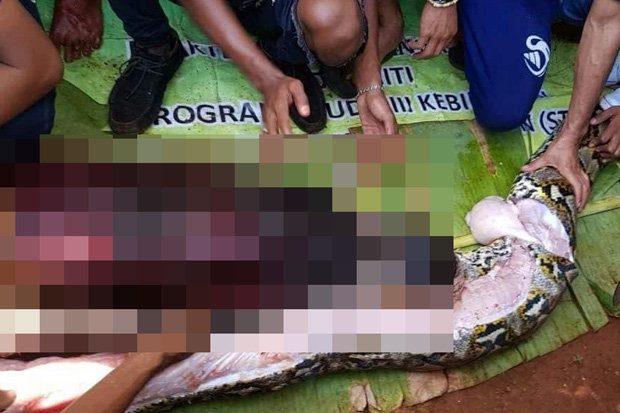 وفي حالة هستيرية، قام السكان المحليون بتقطيع الثعبان بواسطة شفرة وإخراج جثة الضحية واسمها “وا تيبا”، التي كانت مغطاة بالوحل.