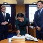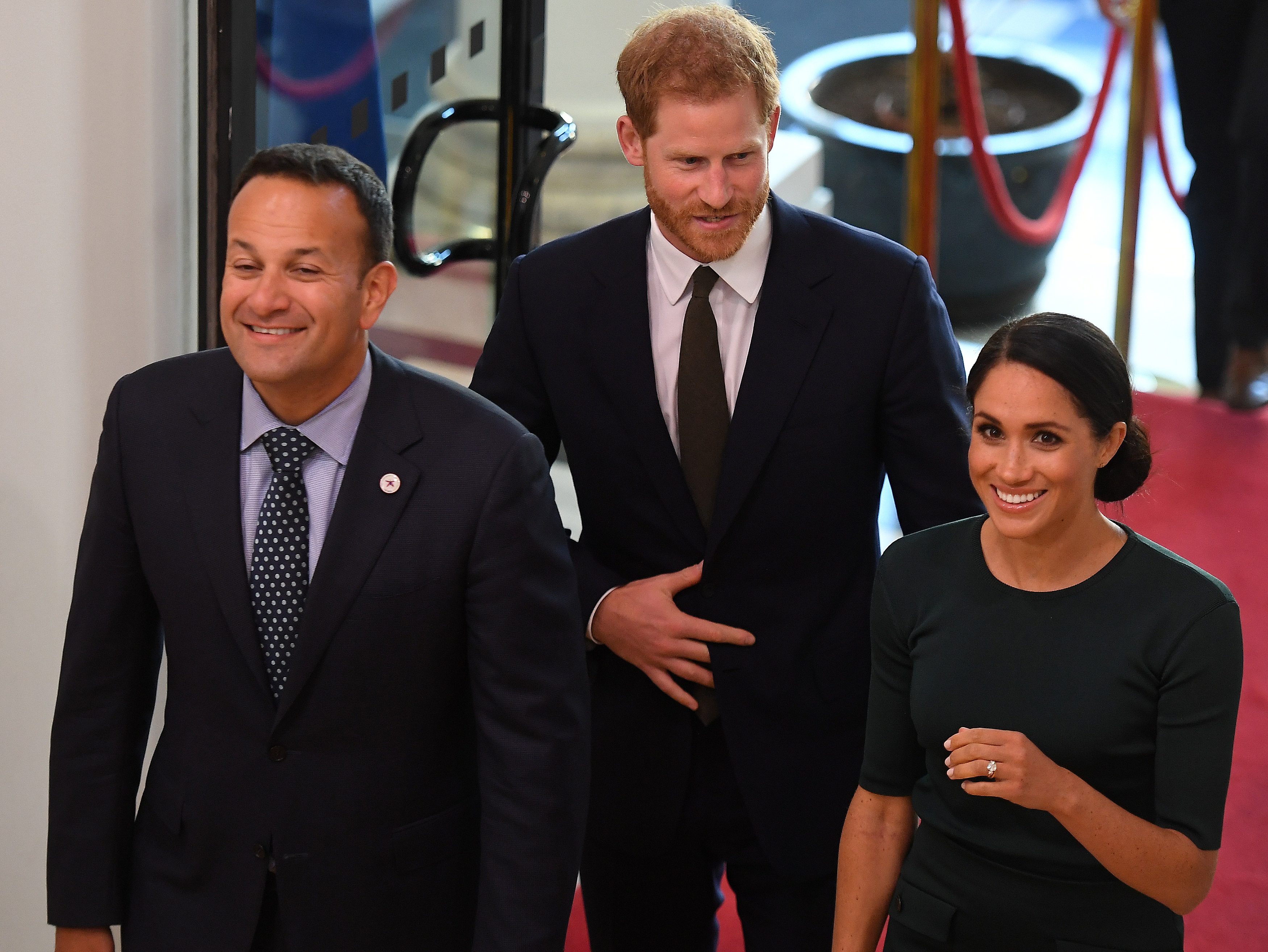 في حين ارتدى الأمير هاري سترة داكنة ورابطة عنق خضراء والتقيا بفارادكار بعد وصولهما إلى مطار دبلن بفترة وجيزة.