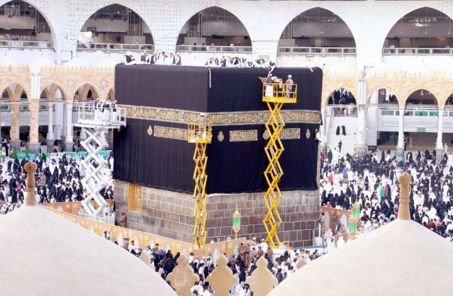 بينما يطوف حجاج بيت الله حول الكعبة، قبل الذهاب إلى عرفات لأداء الركن الأعظم من الحج، فؤجى المصلون بتغيير كسوة الكعبة المشرفة، صباح الإثنين 20 أغسطس/آب 2018.