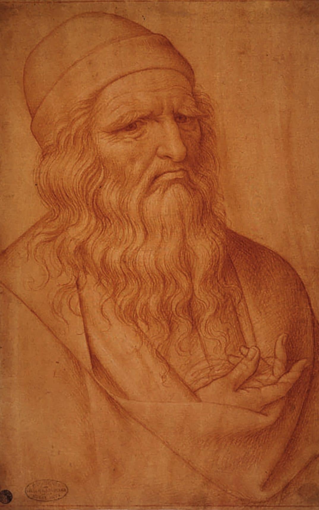 ففي الصورة الطباشيرية ذات اللون الأحمر الداكن التي رسمها جيوفان أمبروجيو فينيو، بدا دافنشي مُسِناً والجزء السفلي من ذراعه اليمنى مُتَّخِذاً زاوية تتجه إلى اليمين من جسده، وقد حُشِرت في طيات ثيابه كما لو أنها كانت مُعلَّقة بحمَّالة طبية.