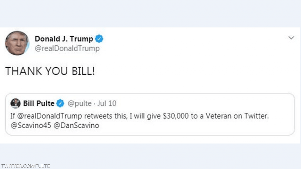 وكتب بيل بولتي تحدياً على تويتر، قال فيه: “إذا أعاد دونالد ترامب نشر هذه التغريدة فسأُعطي 30 ألف دولار لمحارب سابق”.
