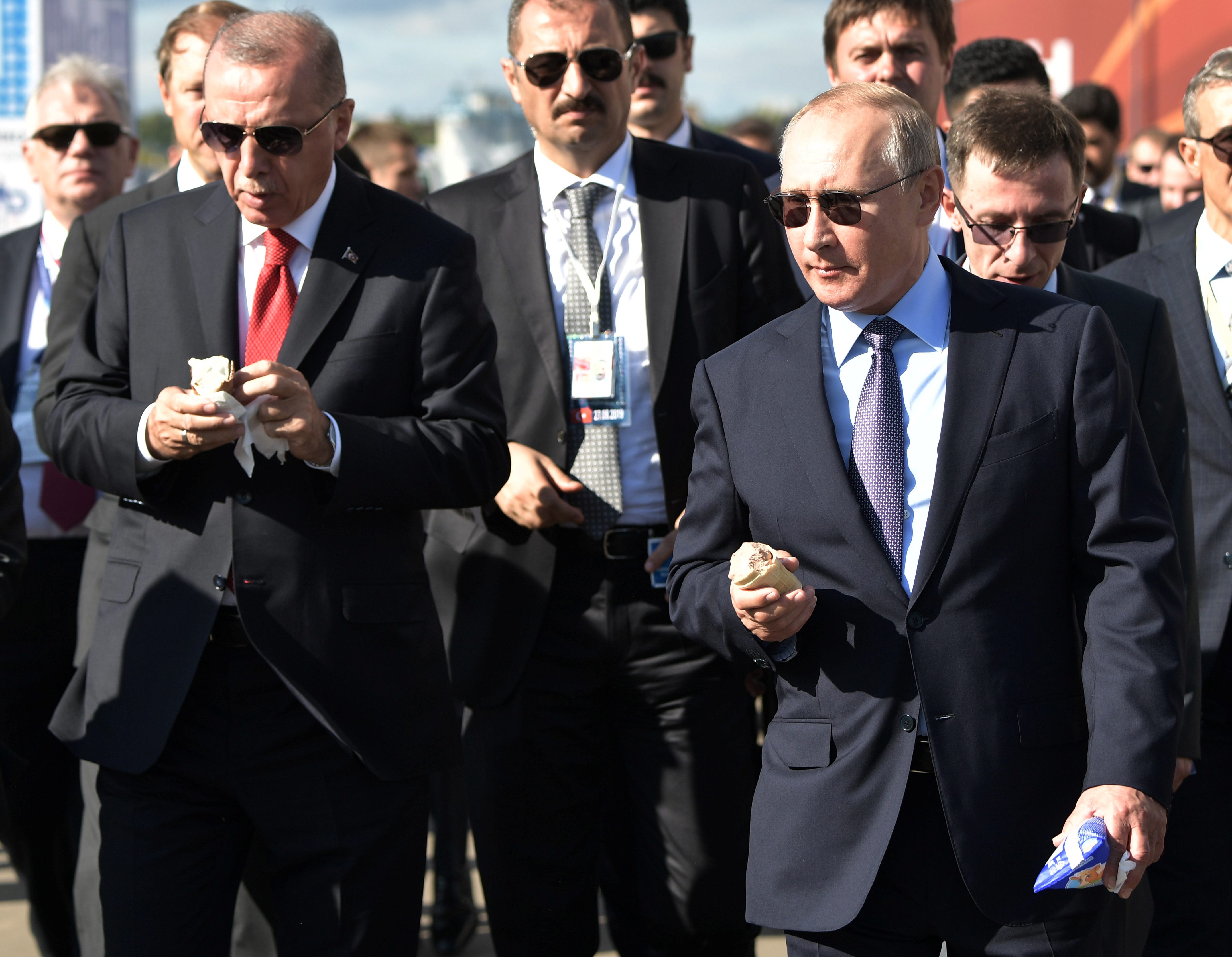 تداولت وسائل إعلام روسية فيديو للرئيس الروسي فلاديمير بوتين وضيفه الرئيس التركي رجب طيب أردوغان، حيث اشترى بوتين لضيفه مثلجات “آيس كريم” خلال جولتهما في معرض للطيران.