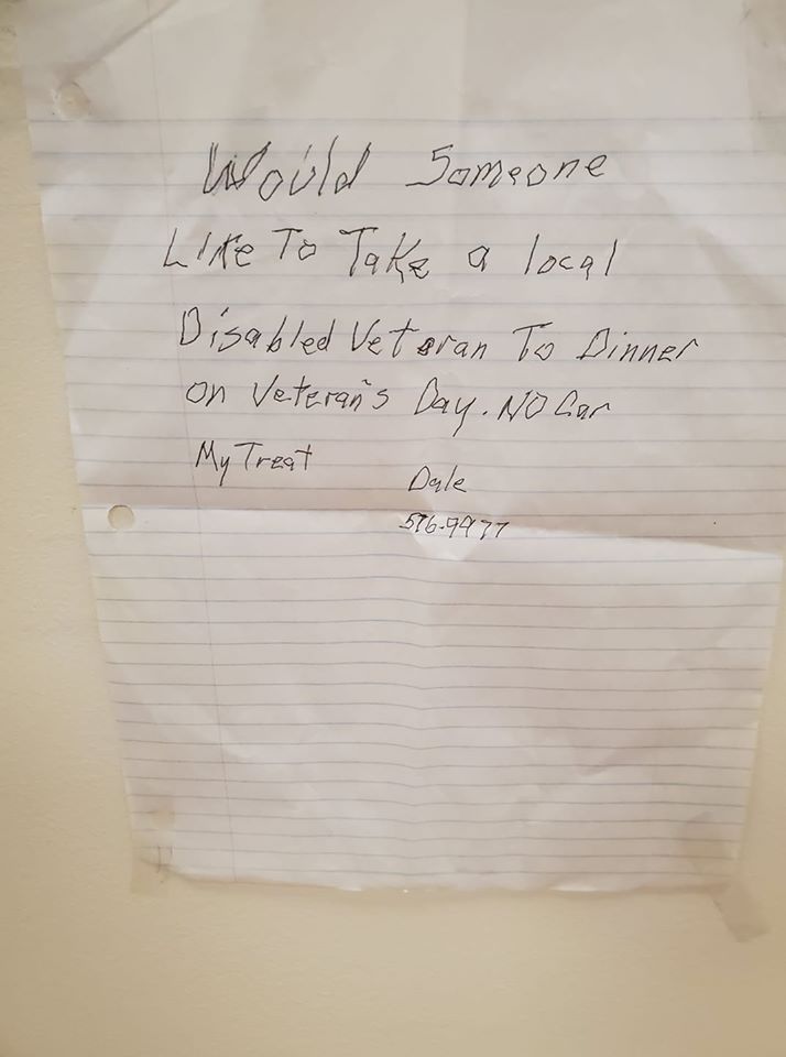 كتب متقاعد مسن رسالةً يطلب من أي شخص أن يرافقه، وتركها في صالون حلاقة بولاية ماين الأمريكية، حيث يعيش، وقال فيها: “هل يود أحد ما اصطحاب المحارب القديم المعاق من أجل تناول العشاء؟” وذيّلها برقم تليفونه، أملاً في أن يجد من يواسيه في وحدته الشديدة، بالخروج معاً لتناول عشاء.