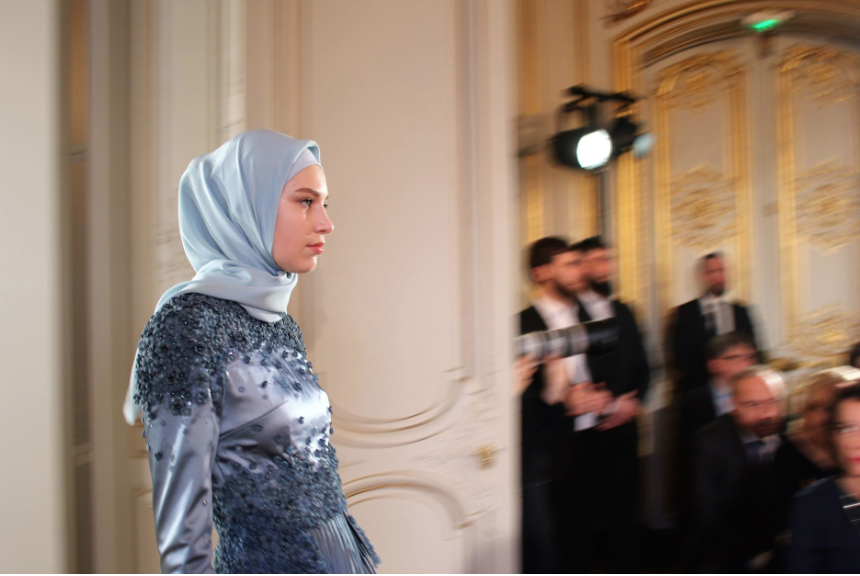 ابنة الرئيس الشيشاني تتألق في عرض عالمي للأزياء بباريس بملابس للمحجبات (فيديو)