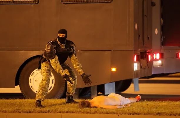 كشف هوية الضابط: التقط فاسيلي فيدوسينكو صورة تيمور غريشكو لصالح وكالة Reuters البريطانية في مدينة مينسك ليلة 10 أغسطس/آب. وفي الصورة يشير غريشكو، الذي يغطي وجهه بقناع أسود، نحو معتقل عاري الصدر ملقى على الأرض. كما التُقِطَ هذا المشهد في مقطع مصوَّر أيضاً.