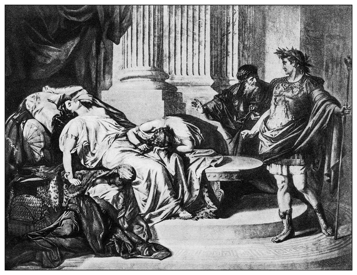 وفي حين أنه من المتفق عليه على نطاق واسع أن مارك أنتوني طعن نفسه في بطنه، لا يزال هناك جدل بشأن طريقة وفاة كليوباترا.
