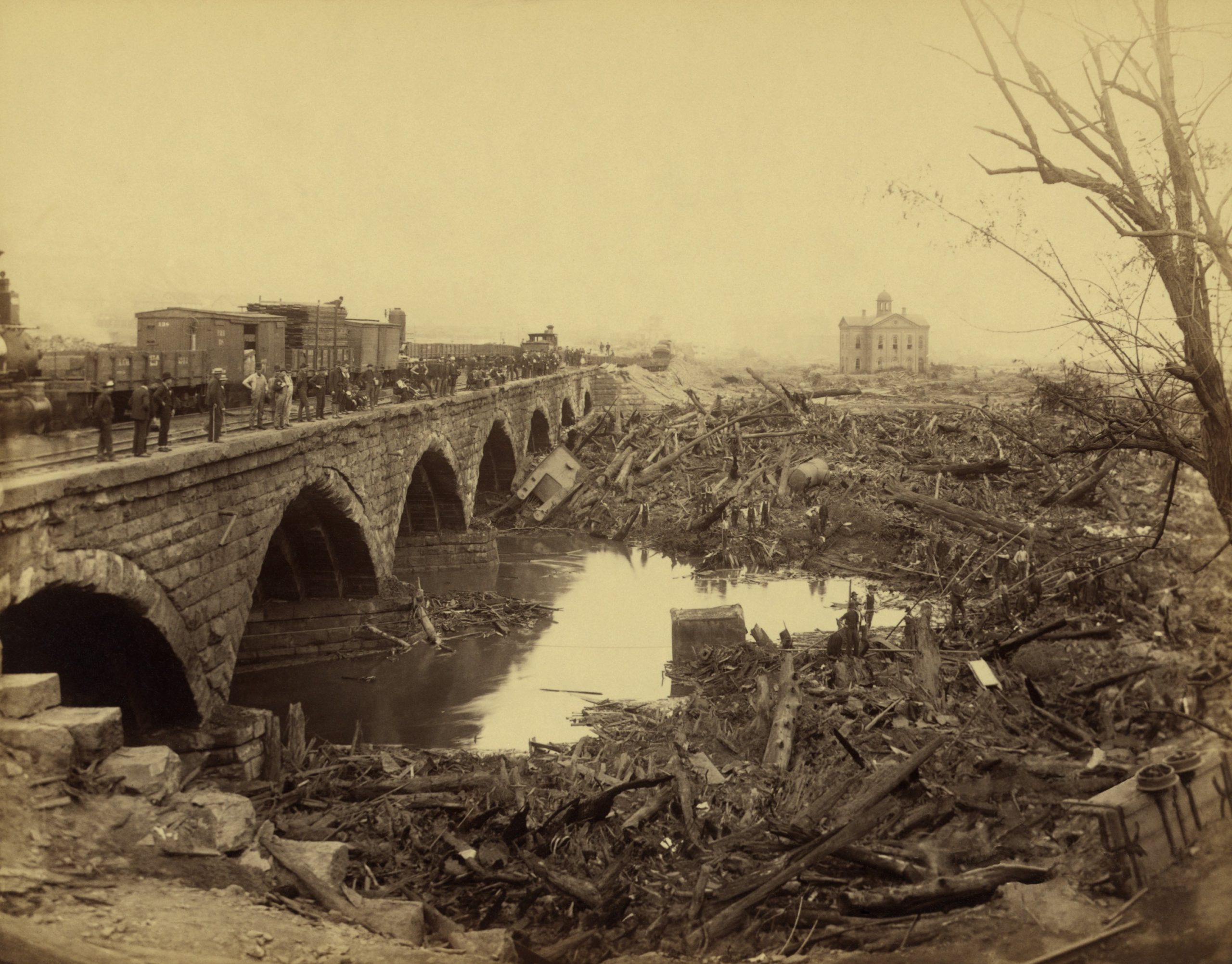 إذ إن الحطام الذي تكون عند نهاية مسار الفيضان عند جسر ستون، الخاص بشركة سكك حديد مدينة بنسلفانيا. تسبب في اندلاع النيران، ما أدى إلى مقتل الناجين الذين كانت قد جرفتهم المياه إلى هناك.