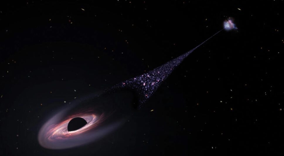 رسم توضيحي  يصور انطباع فنان ثقبًا أسود هاربًا هائلًا تم طرده من مجرته المضيفة نتيجة صراع بينه وبين ثقبين أسودين آخرين