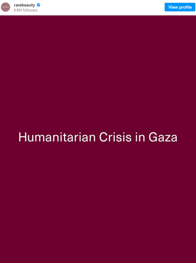 وفق موقع THE TAB، شاركت شركة مستحضرات التجميل Rare Beauty المملوكة لصاحبتها سيلينا غوميز، بياناً حول الوضع في غزة على صفحتها على إنستغرام، تعبّر فيه عن شعورها البالغ بالدمار النفسي بسبب الصور والتقارير الواردة من الشرق الأوسط.