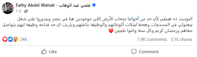 نشر الممثل المصري فتحي عبد الوهاب، عبر حسابه الرسمي على فيسبوك، منشوراً يدعو فيه لتقديم المساعدة وتوفير فرص عمل للفلسطينيين المقيمين في مصر في الوقت الحالي.