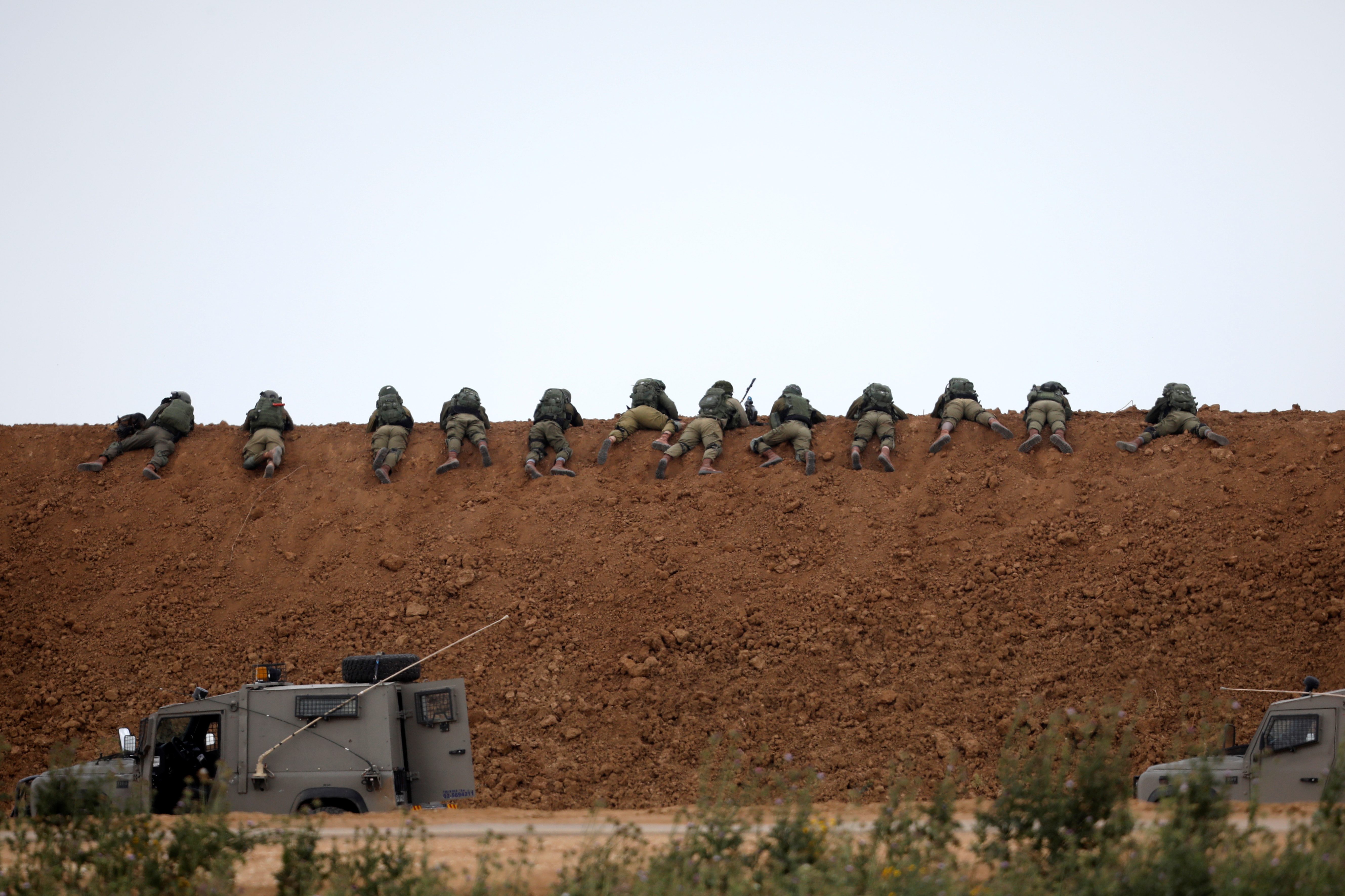 Israeli soldiers are seen next to the border fence on the Israeli side of the border with the northern Gaza Strip Leave a Comment / By محمود صالح / مارس 30, 2018