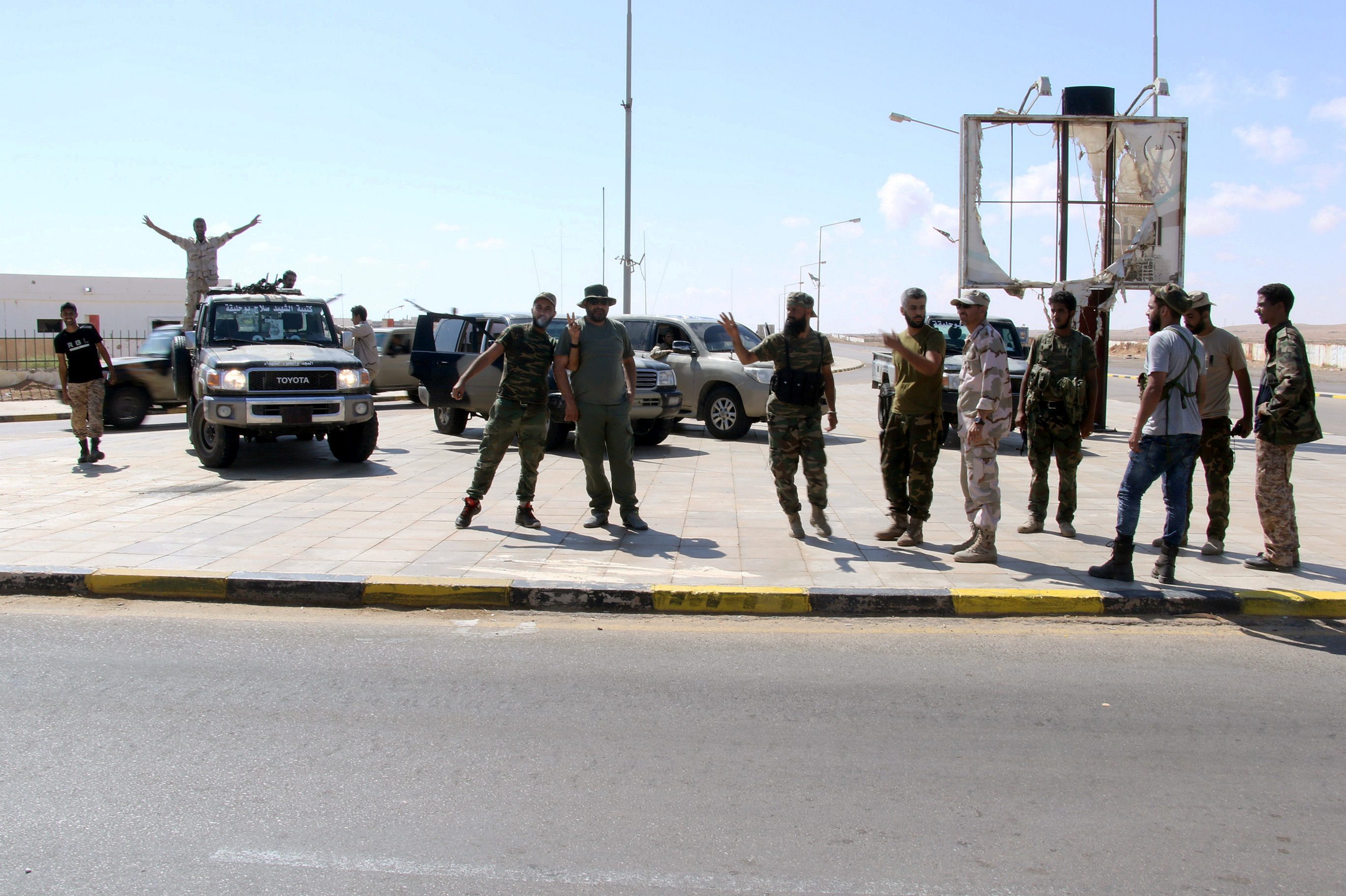 Members of the Libyan National Army stand next to the residential area after clashes to recover oil ports in Ras Lanuf, Libya June 21, 2018. Picture taken June 21, 2018. REUTERS/Stringer. NO RESALES. NO ARCHIVE.