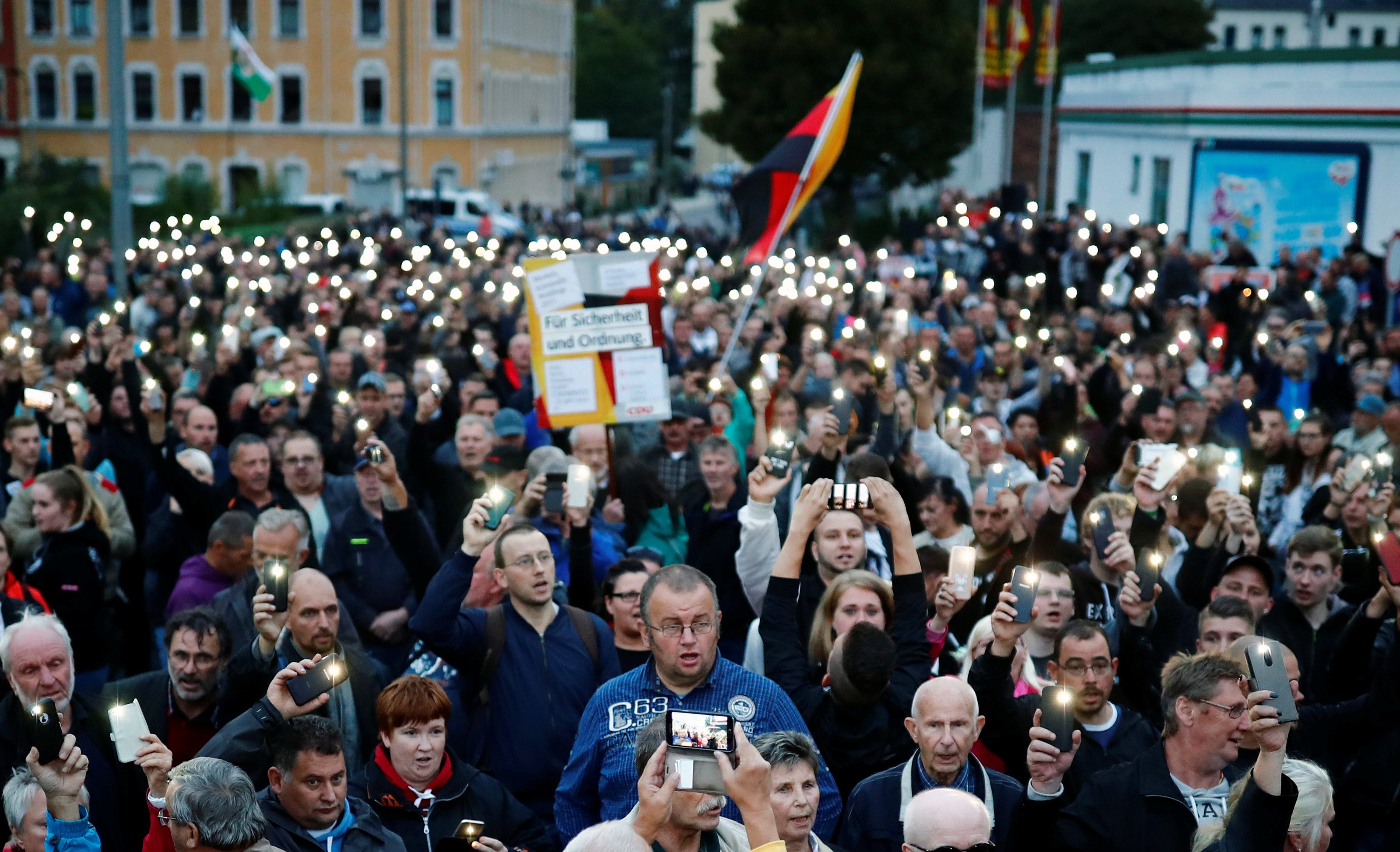 People use the flashlights from their phones as they take part in a protest in Chemnitz, Germany, August 30, 2018. REUTERS/Hannibal Hanschke