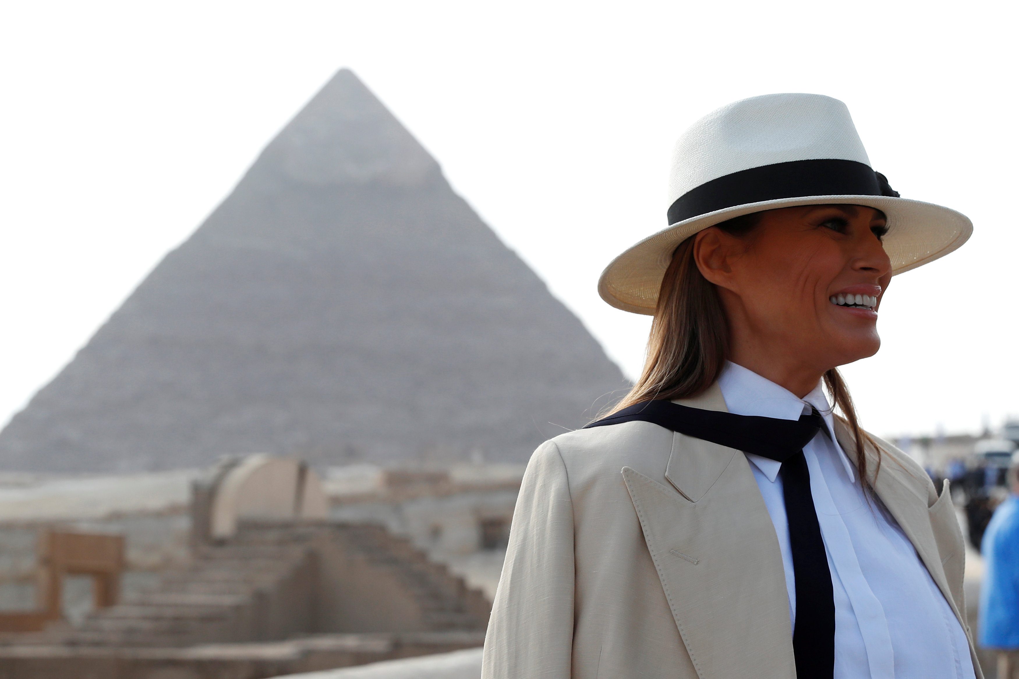 ونادراً ما تتحدث السيدة الأولى للصحافيين، واختارت موقعاً تاريخياً كي تفعل ذلك، قرب تمثال أبو الهول.