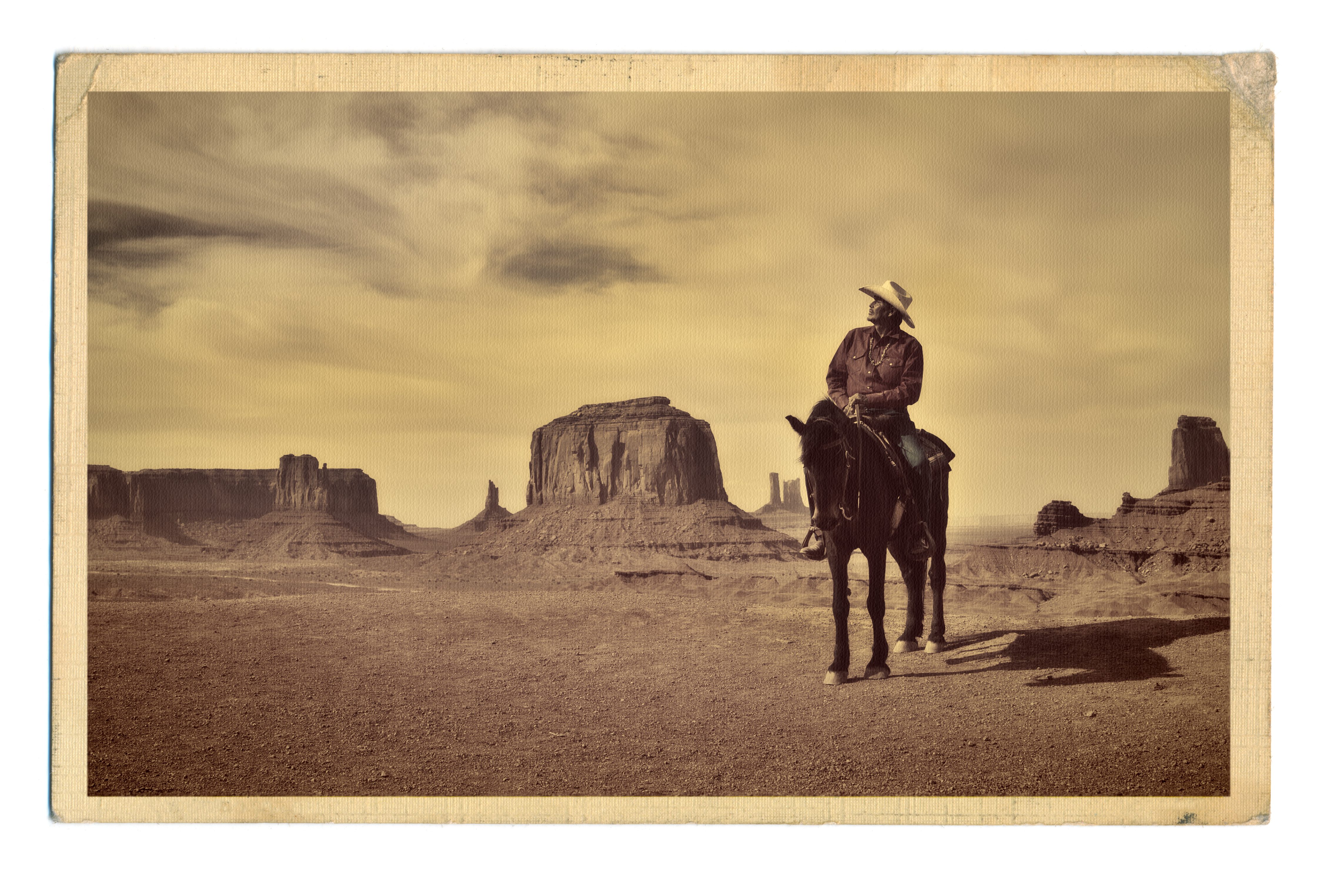 A retro style photo of a native American cowboy and his horse at the edge of a butte cliff at the Monument Valley Tribal Park in Arizona, USA. A famous tourist destination in the southwest USA. The iconic western landscape is a backdrop for many western movies. The native American is a Navajo tribe native. Photographed on location in sepia tone.