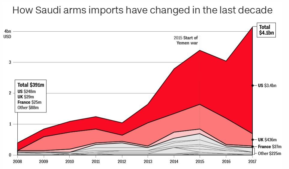يرجع هذا بشكلٍ كامل تقريباً إلى الزيادة الضخمة التي شهدتها واردات الأسلحة من الولايات المتحدة، التي ضاعفت تقريباً قيمة صادراتها إلى المملكة، من 1.8 مليار دولار إلى 3.4 مليار دولار خلال تلك الفترة. كذلك ضاعفت ألمانيا صادراتها من 14 مليوناً إلى 105 ملايين دولار، ولو أنَّه يُتوقَّع انخفاضها بشكلٍ ملحوظ هذا العام بعد قرار التعليق.