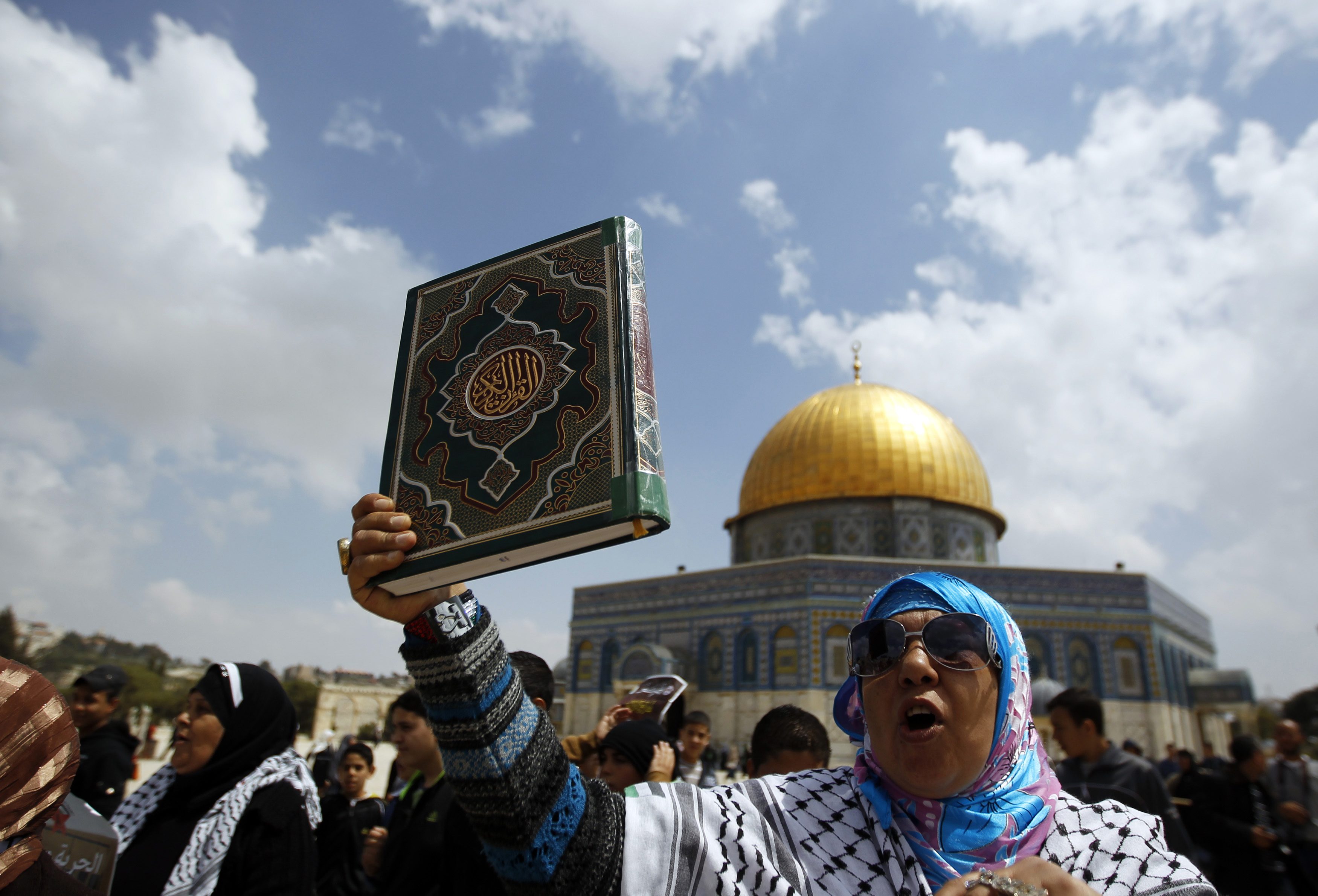 Palestinian woman holds a Koran during a protest calling for the release of Palestinian prisoners held in Israeli jails after Friday prayers in Jerusalem's Old City April 19, 2013. The Dome of the Rock on the compound known to Muslims as al-Haram al-Sharif, and to Jews as Temple Mount, is seen in the background. REUTERS/Ammar Awad (JERUSALEM - Tags: POLITICS CIVIL UNREST TPX IMAGES OF THE DAY)