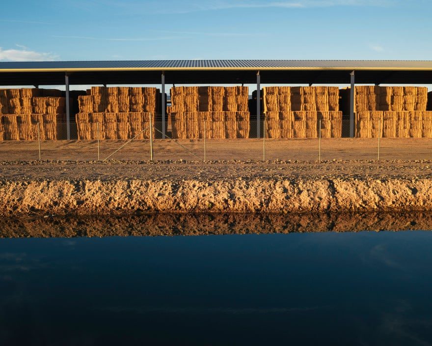 وتصطف المخازن الصناعية الضخمة على الطرف الجنوبي للبلدة، مكتظة بآلاف مؤلفة من أكوام رزم البرسيم الحجازي الجاهزة لتكون طعاماً للأبقار الحلوبة -لكنها لن تطعم أبقار سنترال فالي في كاليفورنيا، أو مراعي مونتانا. إذ سوف يغذي هذا البرسيم أبقاراً في المملكة العربية السعودية.