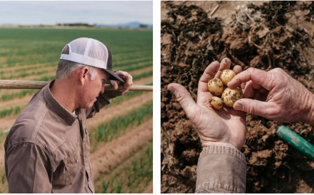 جرانت شافين، صاحب مزارع شافين (يسار). البطاطا الصغيرة التي تزرع في مزارع شافين، بلايث/ الغارديان