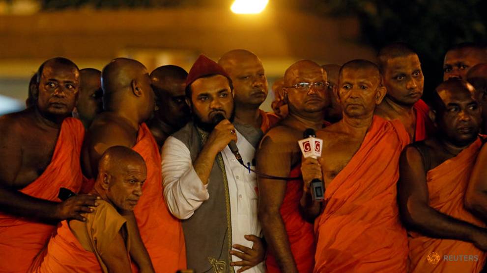 بوذيون بجانب مسلمين في سريلانكا، يعبرون عن تضامنهم ضد العنف الذي تعرض له المسلمون من قبل متطرفين بوذيين عام 2018/ رويترز