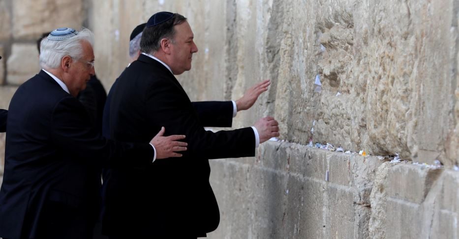وزير الخارجية الأمريكي مايك بومبو والسفير الأمريكي لدى إسرائيل ديفيد فريدمان يلمسان حجارة الحائط الغربي خلال زيارة للموقع في البلدة القديمة بالقدس/رويتررز