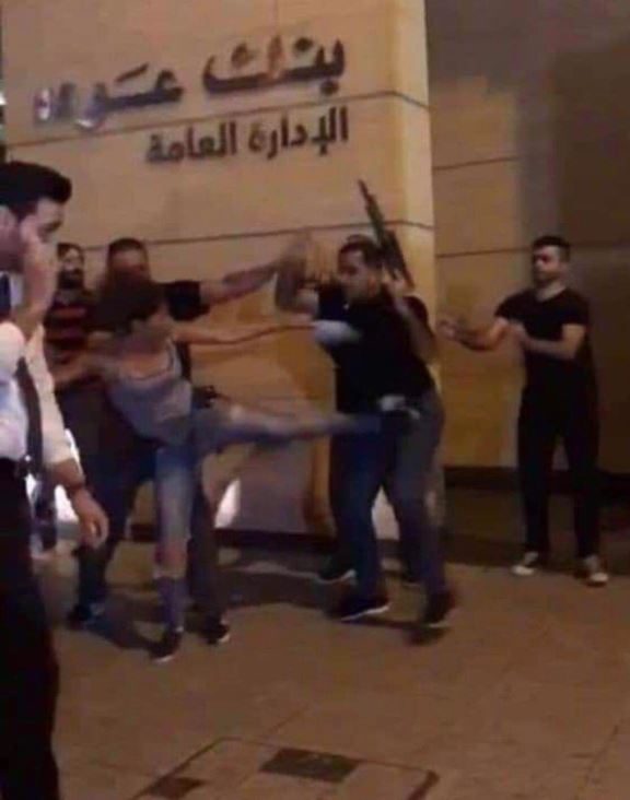 وهنا، فتاة شجاعة ركلت أحد مرافقي الوزير أكرم شهيب الذين حاولوا فض التظاهرات بالأسلحة، وفق رواية رواد الشبكات الاجتماعية.