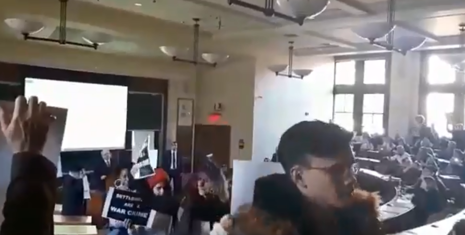 إذ غادر طلاب كلية الحقوق في الجامعة قاعة المحاضرات لحظة بدء القنصل داني دايان إلقاء كلمة حول الاستراتيجية القانونية للمستوطنات الإسرائيلية.