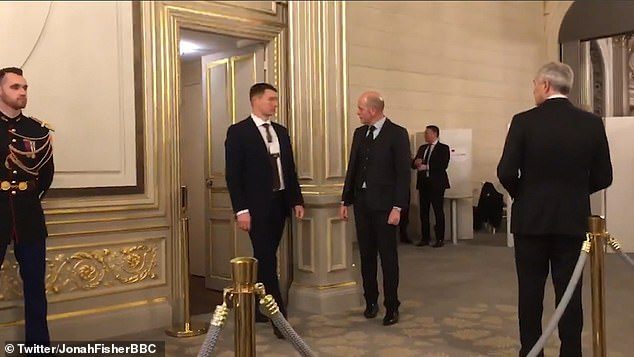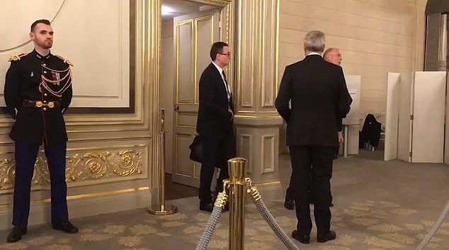 حيث سار حارس سادس آخر خلف بوتين في أثناء مغادرته المرحاض بقصر الإليزيه في باريس.