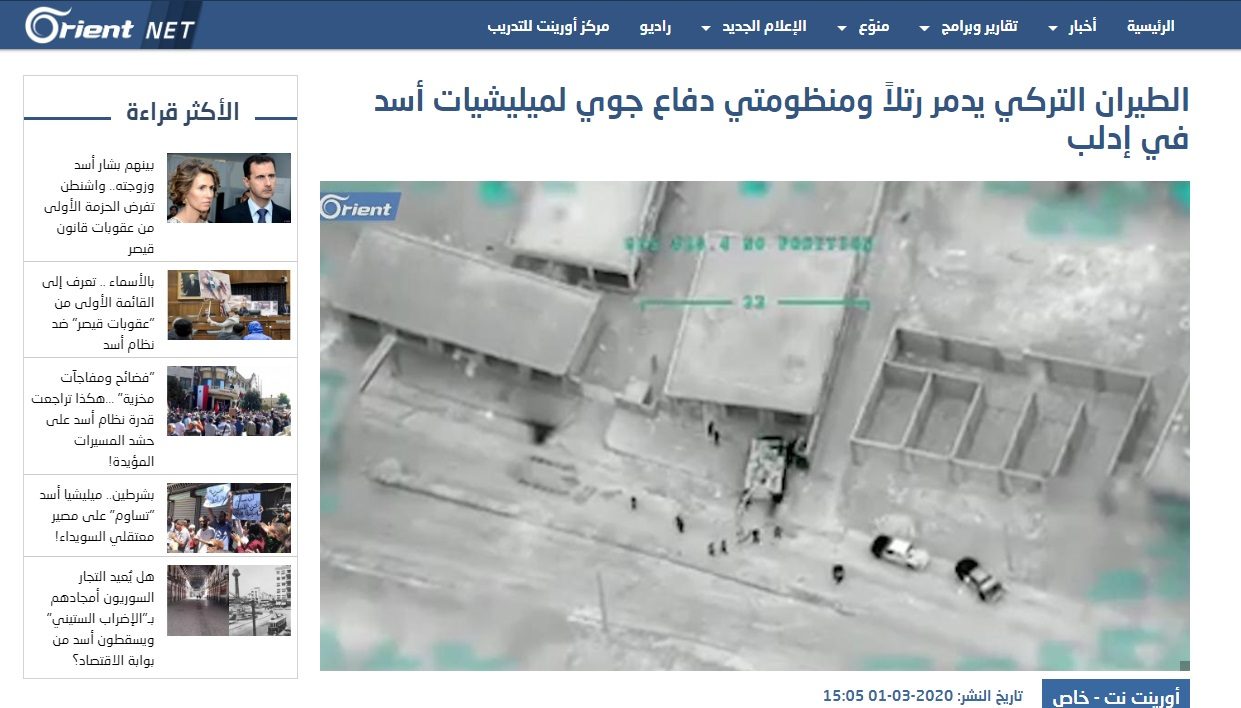 أما الصورة الثانية فنشرها موقع “أورينت” السوري في الأول من مارس/آذار 2020، على أنها تُظهر استهداف الطيران التركي لمعسكرٍ سوري في إدلب.