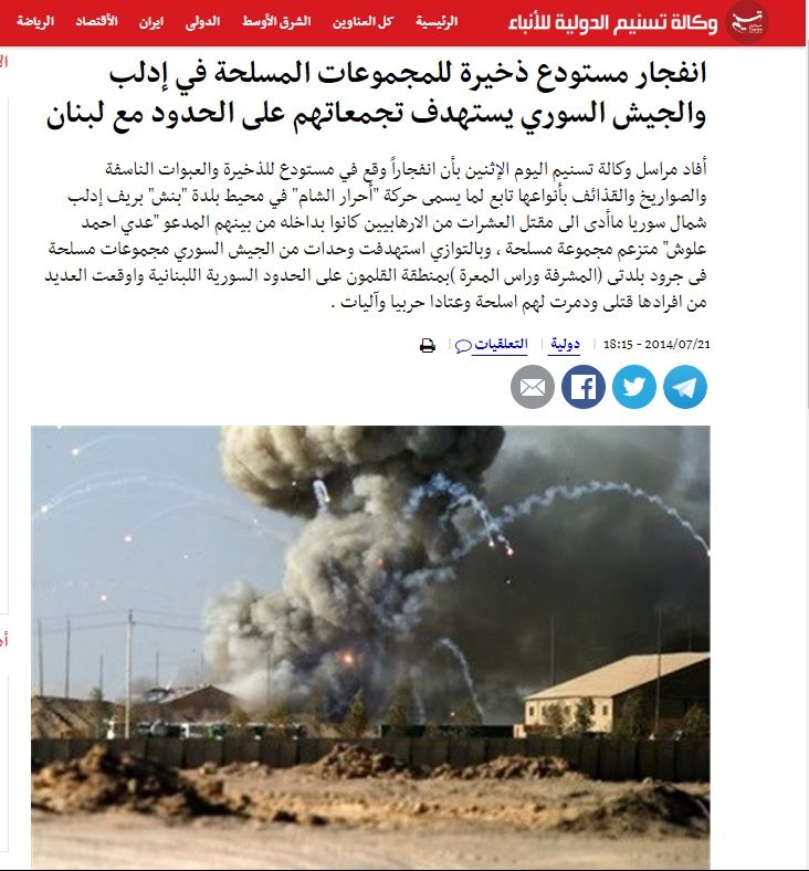 بينما تُظهر الصورة الثالثة انفجاراً لما يبدو أنه مركزٌ عسكري، وقد أرشد البحث عنها إلى الصورة نفسها منشورة في موقع وكالة “تسنيم” الإيرانية عام 2014، إلى جانب خبرٍ عن انفجار مستودعٍ للذخيرة تابع لحركة “أحرار الشام” في إدلب.