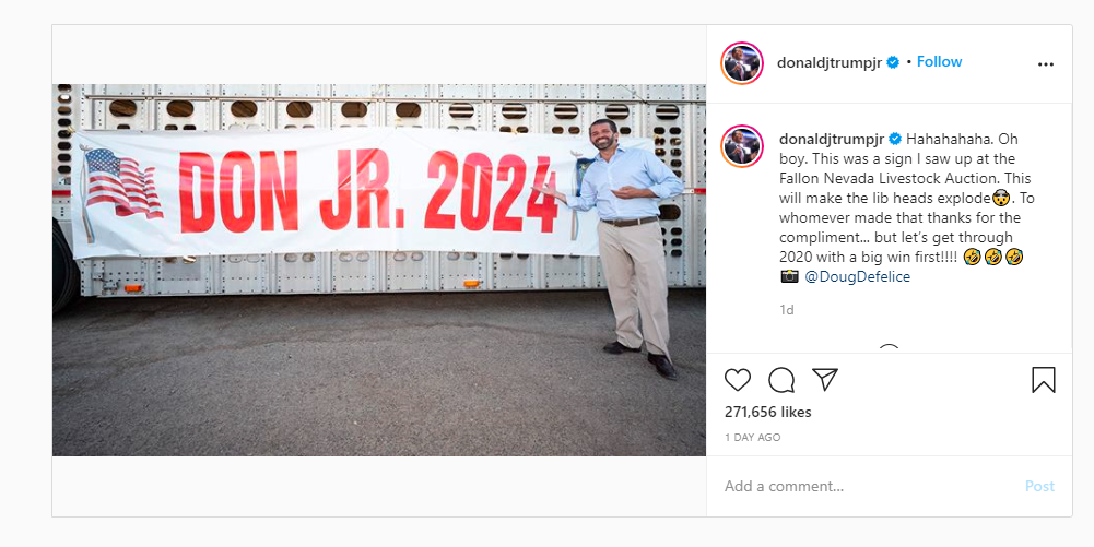 في تدوينته عبر إنستغرام، كتب ترامب الابن إلى جانب صورته: “كانت هذه لافتة رأيتها في مزاد “فالون نيفادا” للماشية، أياً من كان قد أعدَّ هذه اللافتة شكراً على المجاملة، لكن دعونا نعبر 2020 بفوزٍ كبيرٍ أولاً”.