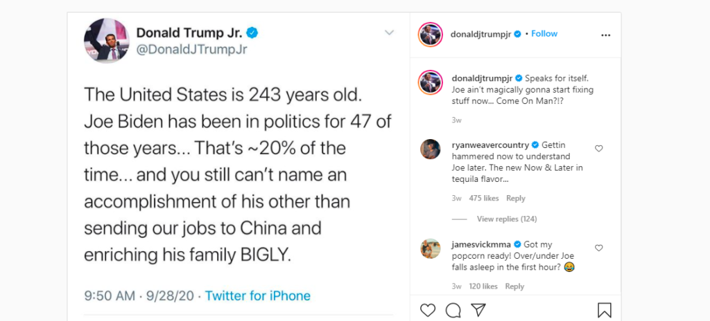 حيث قال ترامب الابن في تغريدته: “يبلغ عمر الولايات المتحدة الأمريكية 243 عاماً، جو بايدن يعمل في السياسة لمدة 47 عاماً من تلك السنوات، بما يعادل حوالي 20% من الوقت، وما زلت لا تستطيع تحديد إنجاز له بخلاف إثراء عائلته بشكل كبير”.