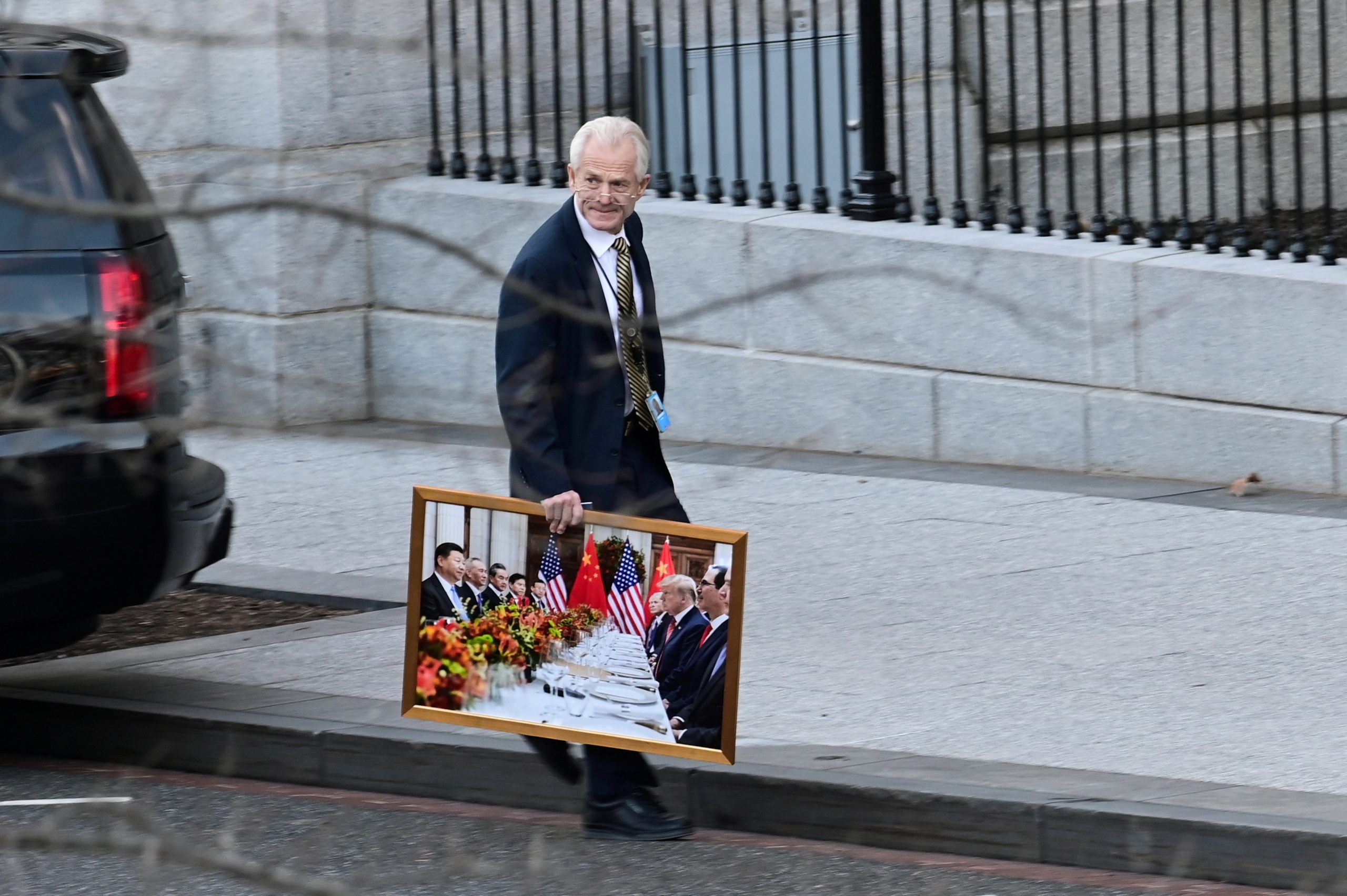 مشهد آخر رصدته عدسات الصحفيين، وهو مستشار البيت الأبيض للتجارة، بيتر نافارو، وهو يغادر الجناح الغربي للبيت الأبيض، ويحمل صورة للرئيس الأمريكي دونالد ترامب والرئيس الصيني شي جين بينغ، في واشنطن.