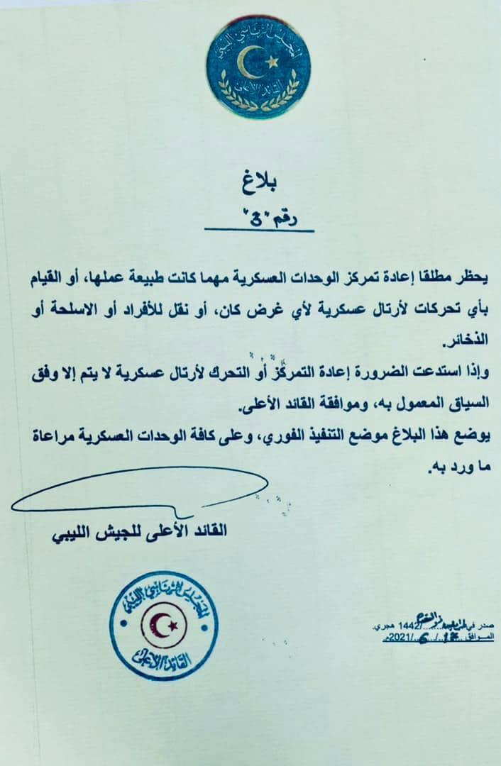 وأوضح المجلس في بلاغ صادر عنه، بصفته القائد الأعلى للجيش، حظره أي إعادة تمركز لوحدات عسكرية مهما كانت طبيعة عملها، أو تحركات لأي غرض كان، أو نقل للأفراد أو الأسلحة أو الذخائر.
