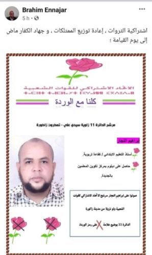 ففي حزب الاتحاد الاشتراكي للقوات الشعبية، وعد أحد المرشحين ساكنة بـ”الثروات وإعادة توزيع الممتلكات وجهاد الكفار إلى يوم القيامة”، وذلك في تعليق على حسابه في فيسبوك.