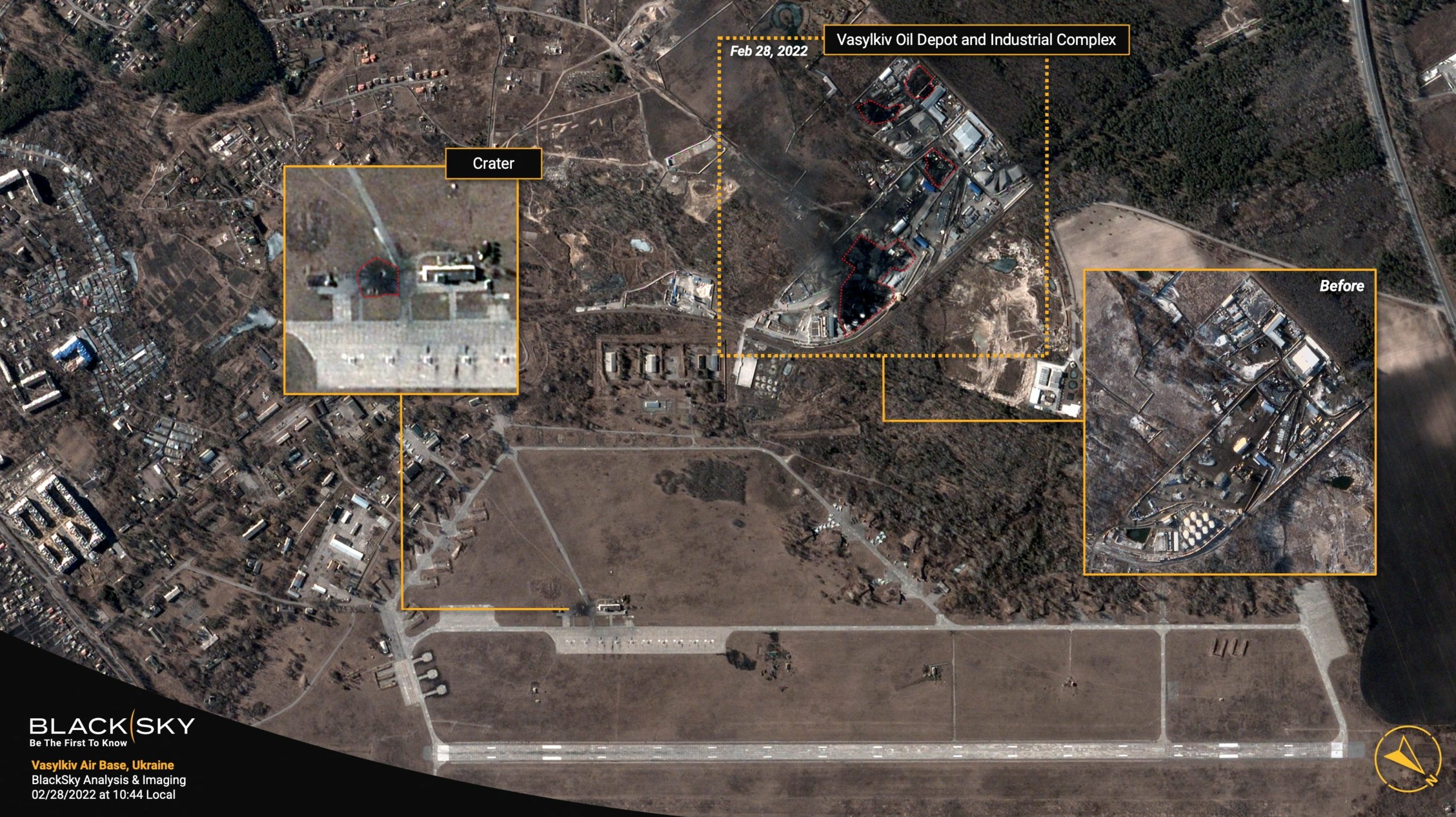 بدت في الصور صفوف طويلة من المركبات تسير خلف بعضها البعض على طرق في الريف الأوكراني، وبقربها في بعض الأحيان دخان قالت الشركة إنّه ناتج عن حرائق في المباني المجاورة.